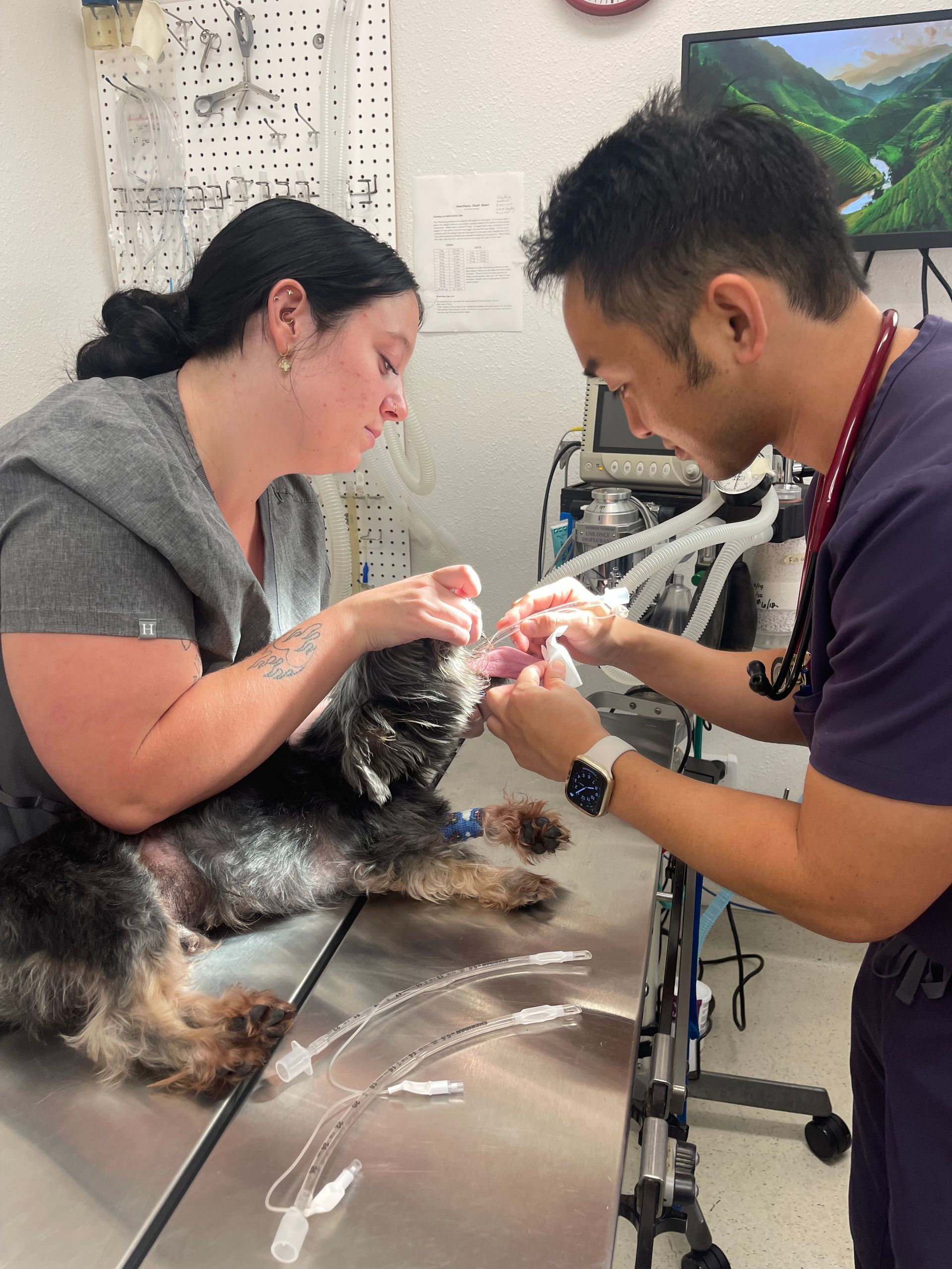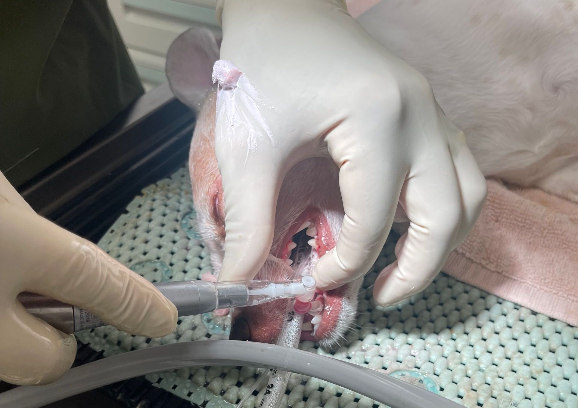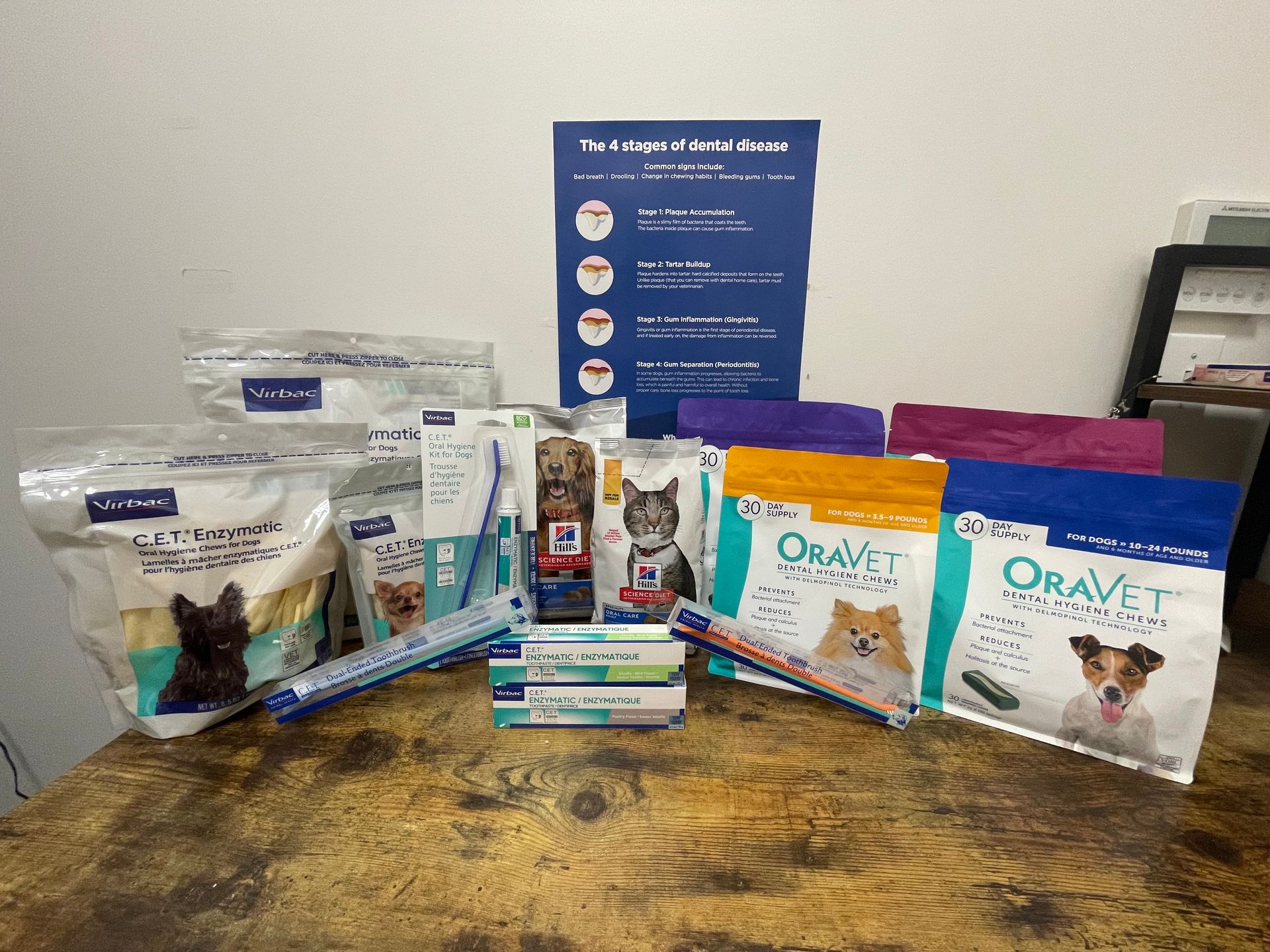 We offer complete dental cleanings on Mondays, Wednesdays, and Thursdays. During this procedure, your pet will be sedated and placed under general anesthesia. Performing this procedure while under anesthesia allows our staff to ensure that we are getting a complete look at your pet's mouth, teeth and gums. Most of the time, our pets will not allow us to manipulate their heads to see each tooth from all angles while awake. Dentals include cleaning your pet's teeth with an ultrasonic scaler, polishing, and application of a sealant which helps to prevent plaque from building up. Before cleaning your pet's teeth, the doctor will check if your pet needs any extractions, which will be performed during the dental. To prolong the benefits of the dental cleaning, we highly recommend to brush your pet's teeth daily. To encourage this, with every dental we will provide you with a starter kit which includes: a dual ended toothbrush, poultry flavored toothpaste, and a finger brush. If your pet is allergic to poultry, we do offer vanilla mint as a flavor. Upon availability, we will also send home a sample bag of the Science Diet Oral Care food.